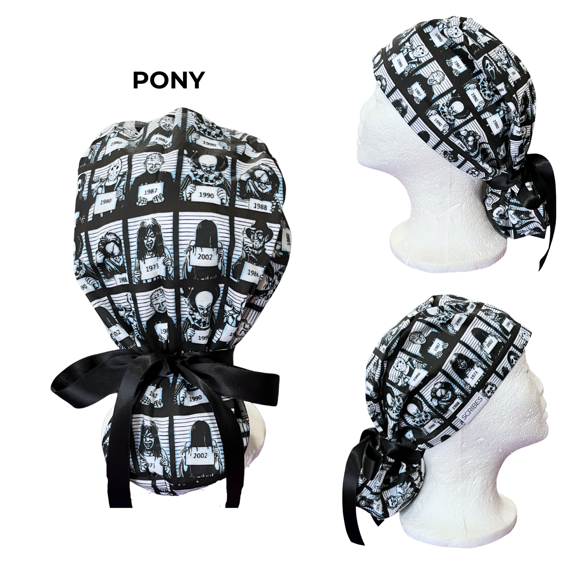 Blue Tine Jail lin up of horror movies villain Halloween in Pony Scrub cap