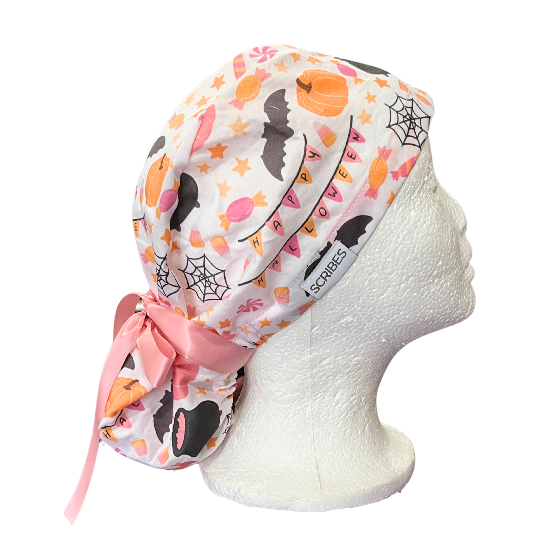 Happy Halloween with pumpkins and bats in Pony Scrub cap